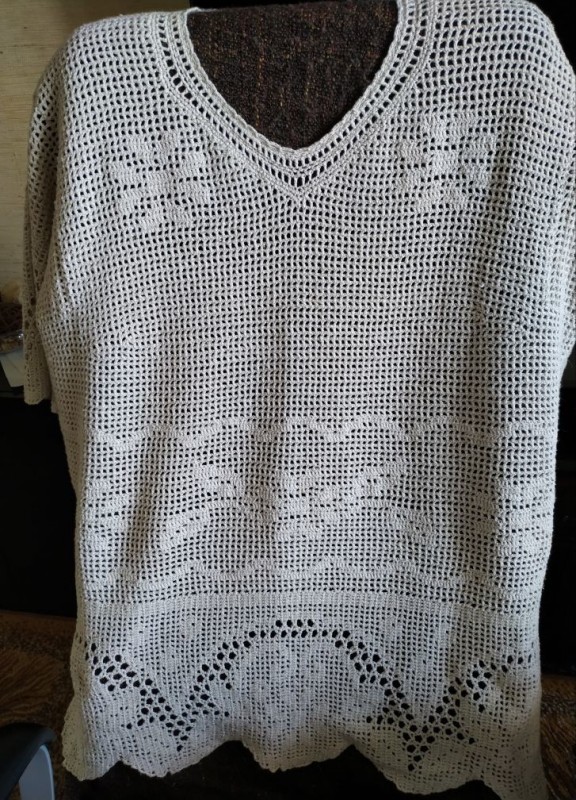 Связала себе костюм из пряжи Кудельница ПНК им.Кирова 60% хлопок 40% лен 500м в 100г. Нитки очень приятные к телу, правда не совсем очищенные, часто встречаются катышки и темные соринки, которые приходится убирать при вязании.