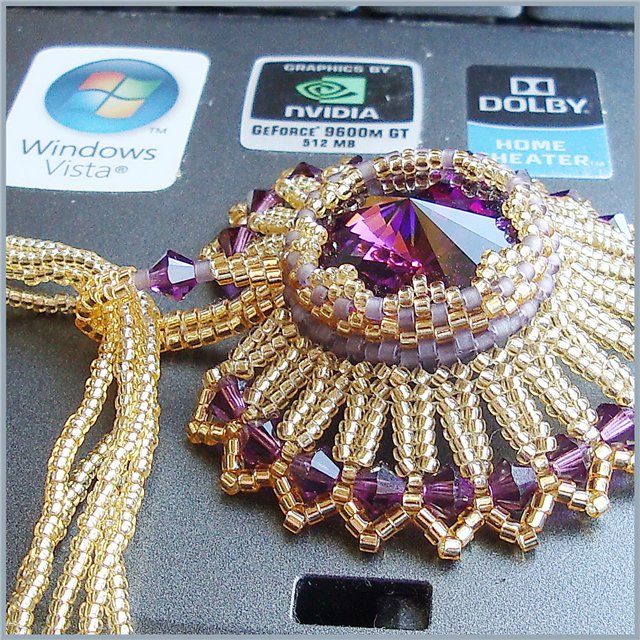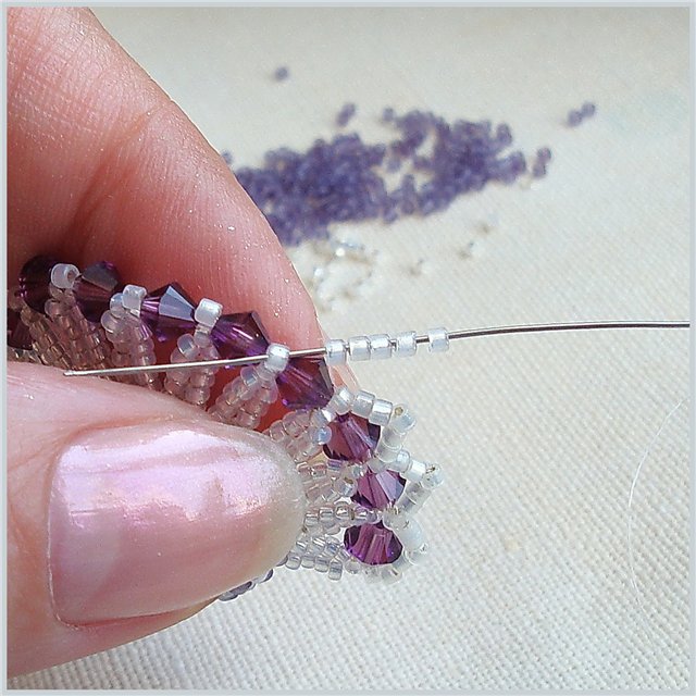 Обшиваем риволи - набрать 36 бисерин Delica белого опала на сдвоенную мононить, пройти иглой в петлю, вернуться в колечко, подтянуть и шить следующий ряд мозаики Delica аметистового цвета, потом проход мозаики бисером 15 размера, затягиваем мононить.
