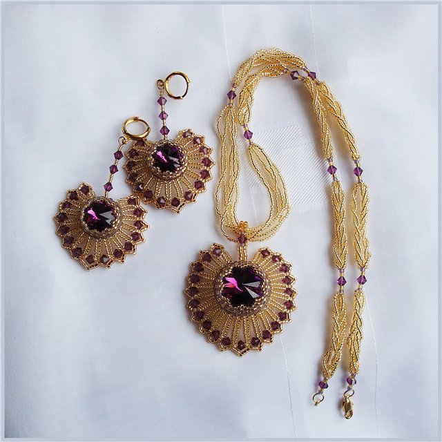 Для того, чтобы камень был повыше и выделялся на серьге, добавим по готовой оплетке еще 2 ряда Delica аметистового цвета, стянуть последний рядом бисера 15 размера.