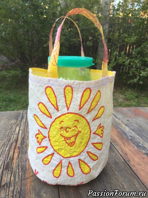 Если на пакете пишут, что он выдержит 15, 21, 35, и т.д. кг, то такая сумочка из восьми - десяти слоёв, да ещё пропаянных и скукоженных, сколько должна выдержать? Делала часа 2 с отвлечениями по хозяйству, в том числе пол часа ушло на то, чтобы найти путём логических размышлений и проблесков памяти эту кальку, куда-то переложенную мной в другое место за каким-то фигом (хотела как лучше..., поближе, как оказалось).