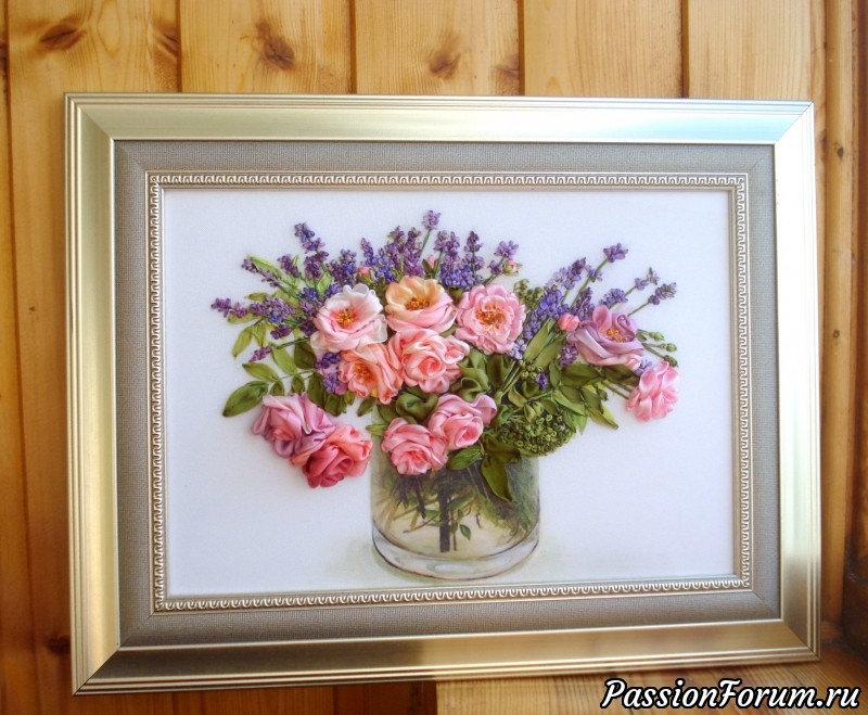 Букет с нежными розами и веточками лаванды вышит лентами из натурального шелка. Авторская работа по мотивам картины художницы Hashimoto Fujico. Основа - габардин. Ваза покрыта 3D-гелем, что создаёт эффект стекла. Оформлено в серебристую рамочку без стекла.