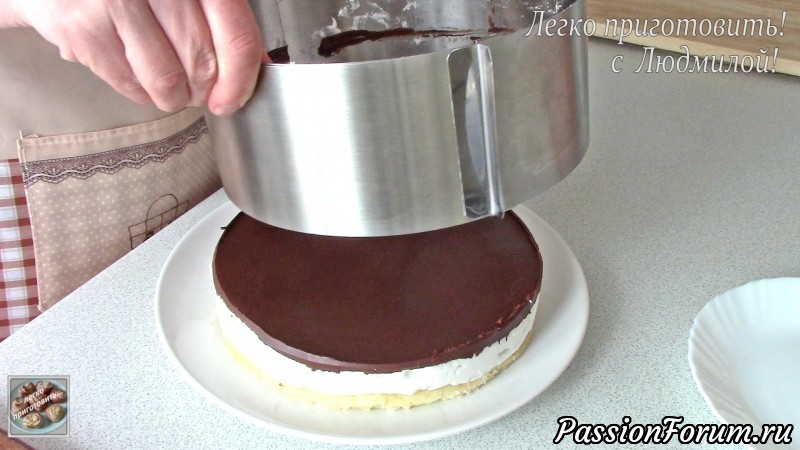 Затем перекладываю его на тарелку, на которой буду собирать торт. Кладу корж гладкой стороной вверх. И сразу ставлю бока от разъемной формы, чтобы к тому моменту, когда крем уже будет полностью готов, можно было бы сразу начать собирать торт.