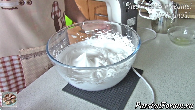 Начинаю взбивать его миксером сразу на максимальных оборотах до мягких устойчивых пиков. При хорошем качестве отвара и достаточно мощном миксере на это может понадобиться всего 3 минуты. За это время отвар должен побелеть, превратиться в хорошую пышную устойчивую пену и увеличиться в объеме в несколько раз.