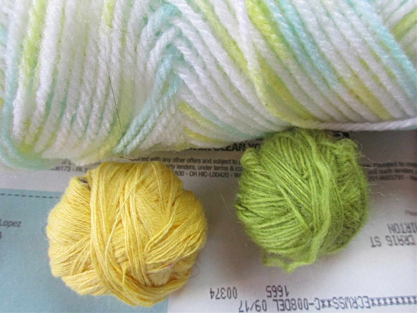 Тут я взяла всего по 1 волокну бледного секционного акрила, шерсти цвета киви, и тонюсенькую х/б ниточку жёлтого цвета: