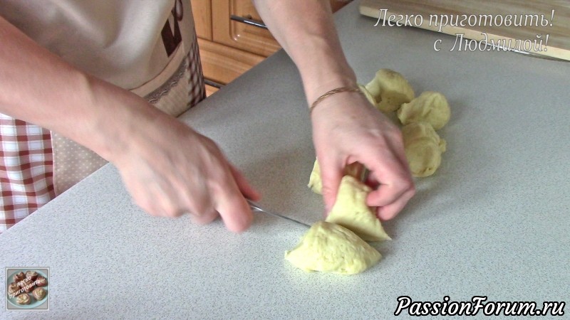 Затем тесто достаю из холодильника, вынимаю его из пакета и делю на восемь примерно одинаковых частей. Каждую часть теста подкатываю в шар и пока откладываю в сторону.