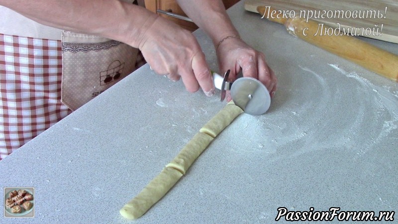 А затем подготовленный пласт теста скручиваю в очень тонкий "рулетик".