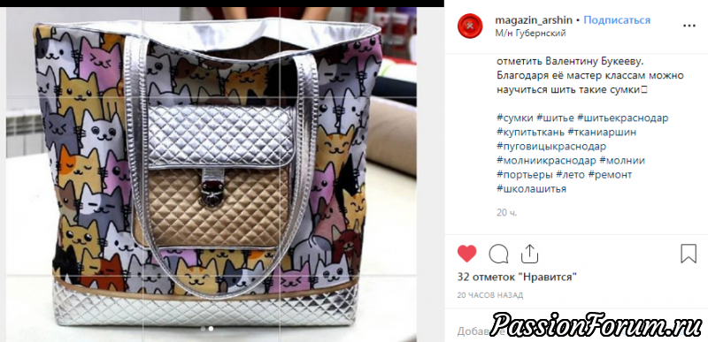 Все материалы, для пошива сумки приобретала в магазине Аршин. И, когда пришла с готовой сумкой в магазин, продавцам понравилось изделие. Так появилась публикация в инстограм.