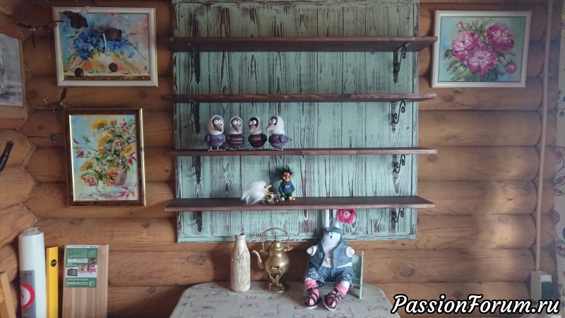 Основной целью было, конечно, реставрировать шкаф для его использования и за счет цвета немного разбавить коричневые и желтые краски внутри дома. В комментариях многие спрашивали насколько гармонично шкаф вписался в интерьер. Скажу, что неплохо, тем более, что были сшиты шторы. Но тем не менее, я планировала в этом году сделать на стену два барельефа из цветов и покрасить их аналогичной краской. И вот пришло лето. Для барельефа все было куплено, фанера осталась от полок шкафа и можно было бы начинать, но... Здесь подумалось, что практического применения от барельефа не будет никакого, и было решено сделать полки в тон шкафу, чтобы и красиво и с пользой.