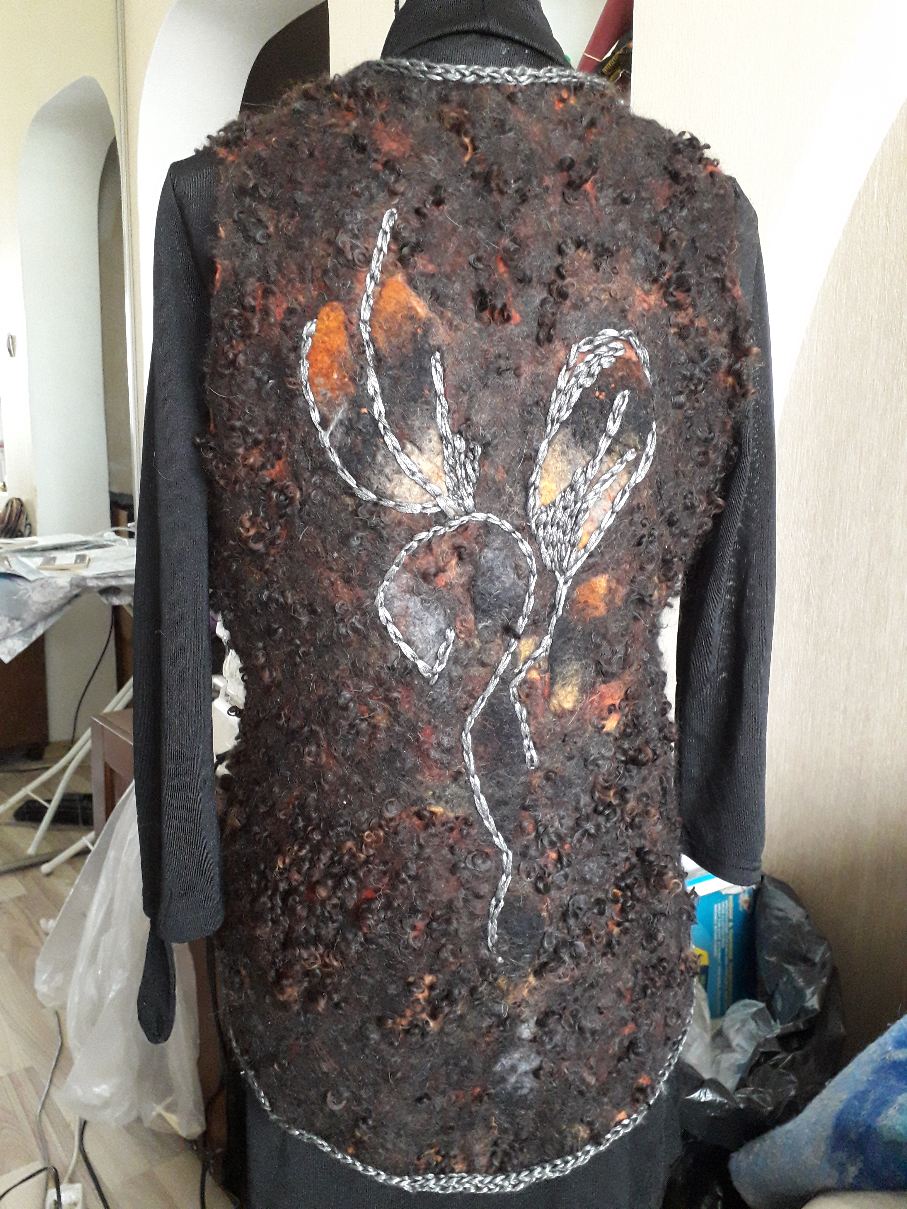 Шерсть в топсе, кудри, шелк маргиланский шелк на подкладке.Вышивка шерстью, и окантовка жилета шерстяной тесьмой связанной из шерстяной нитки.По просьбам девочек,добавляю фото,где можно покрупнее рассмотреть фактуру жилета.