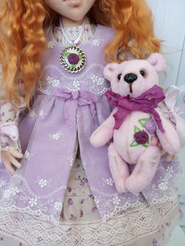 Одежда вся съемная. В комплекте: гольфики, панталончики,маечка. платье,сарафанчик. кулончик вышит мной, мишка с вышивкой на животике(полностью сшит вручную),веночек, сапожки фабричные,две заколочки,клеточка с птичкой.Рост девочки-42см, мишки- 14см.