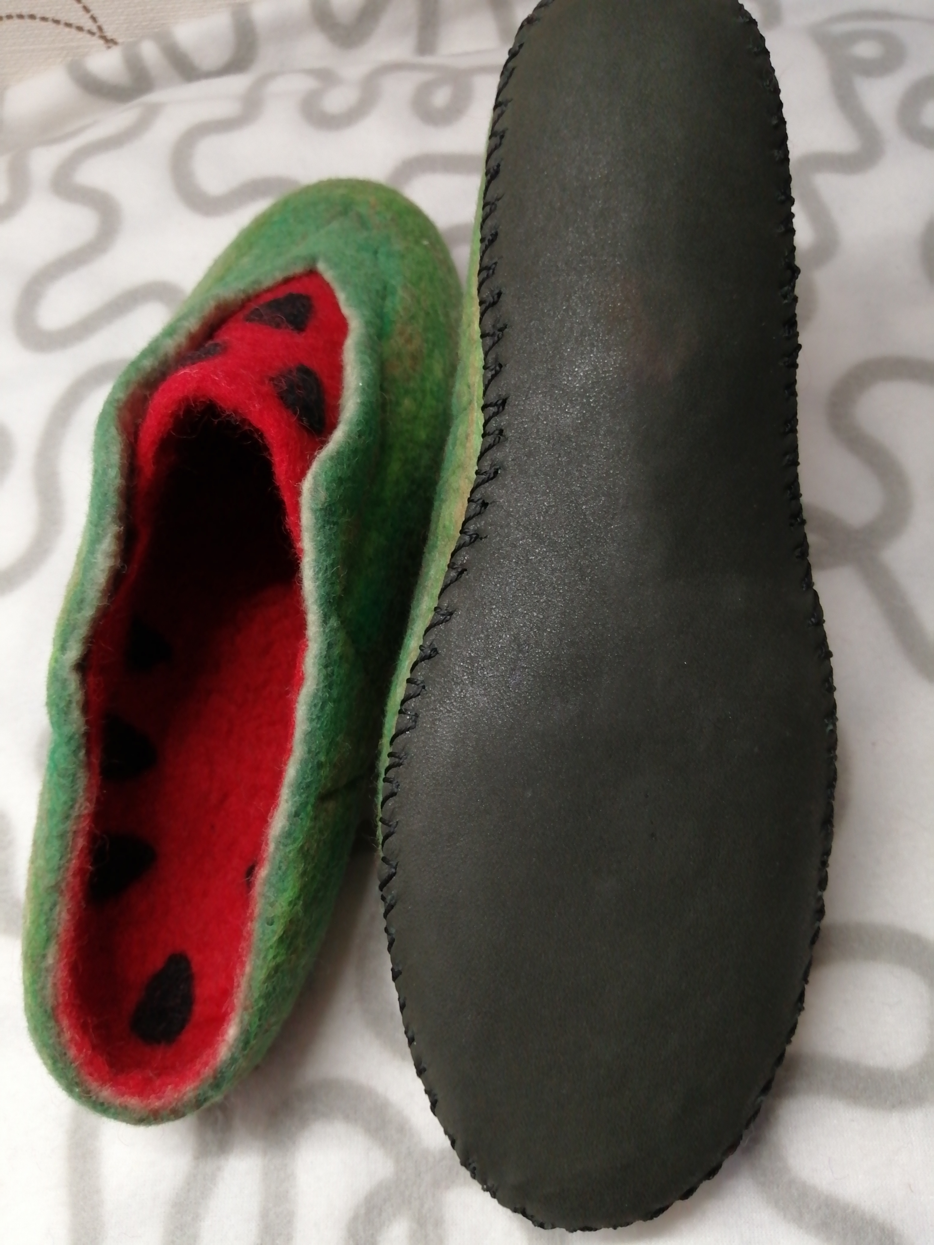 Свалялись еще 2 пары тапочек. Арбузики валялись с блокираторами, пришлось в готовом виде прошить слои, чтобы сильно не раскрывался вырез. Не получается делать строчку ровной, надо тренироваться.