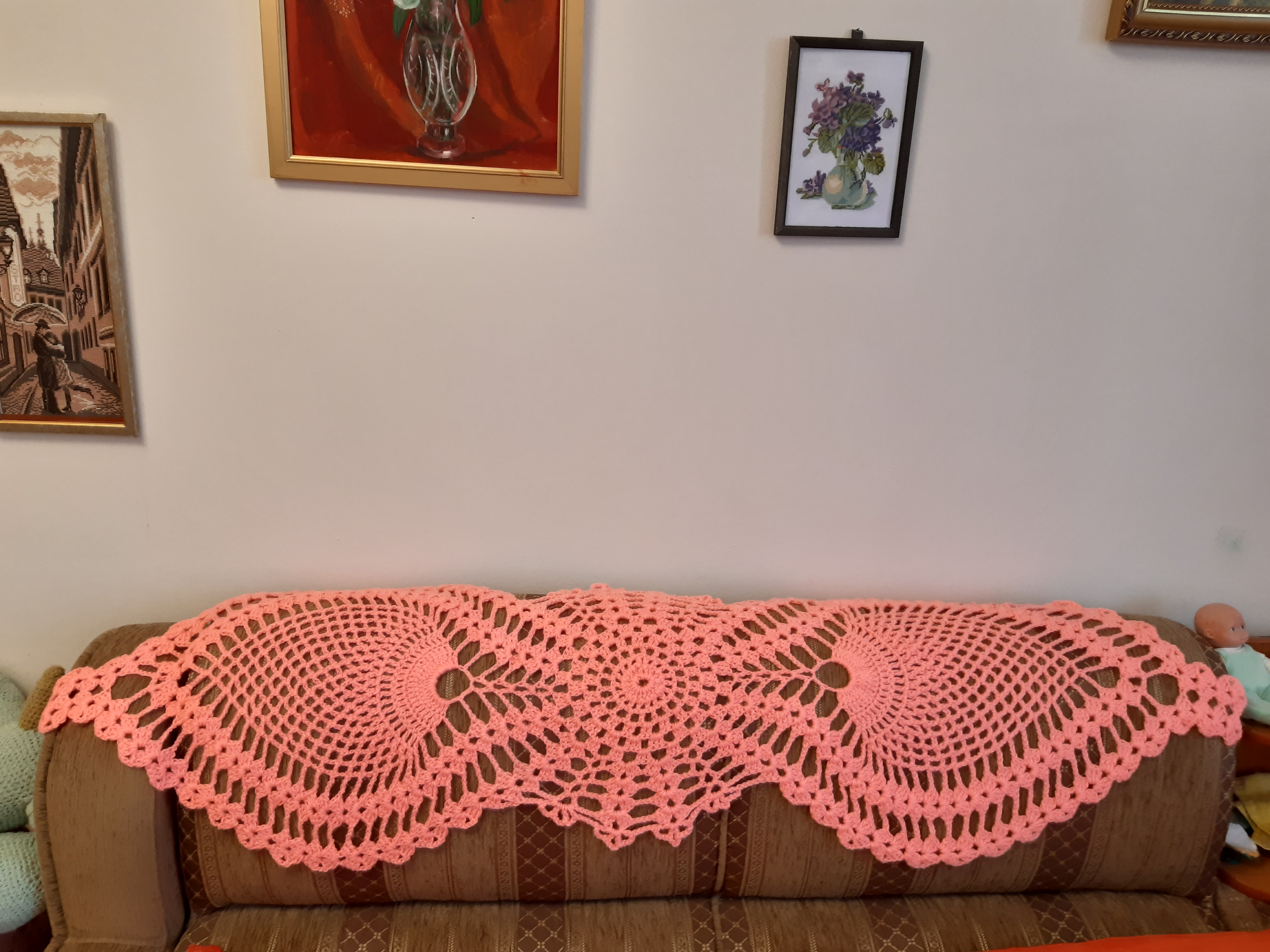 На спинку дивана салфетка по той же схеме, что белая (у зеркала с матрешкой)?