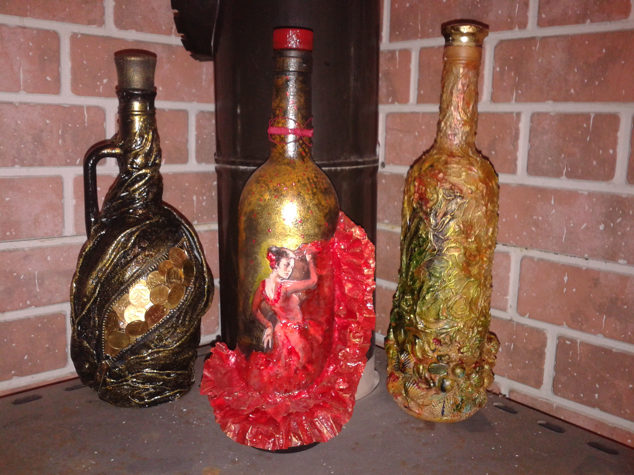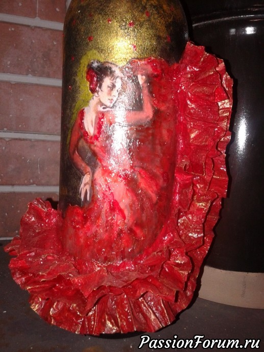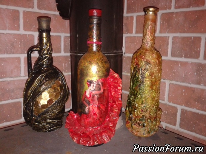 Наших мастериц таким не удивишь, все делали и не один раз. Но эти бутылочки были сделаны по просьбе друзей. И выбраны были из интернета. Даже картинку танцовщицы выбрали определенную. Вот что получилось.