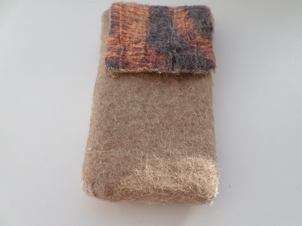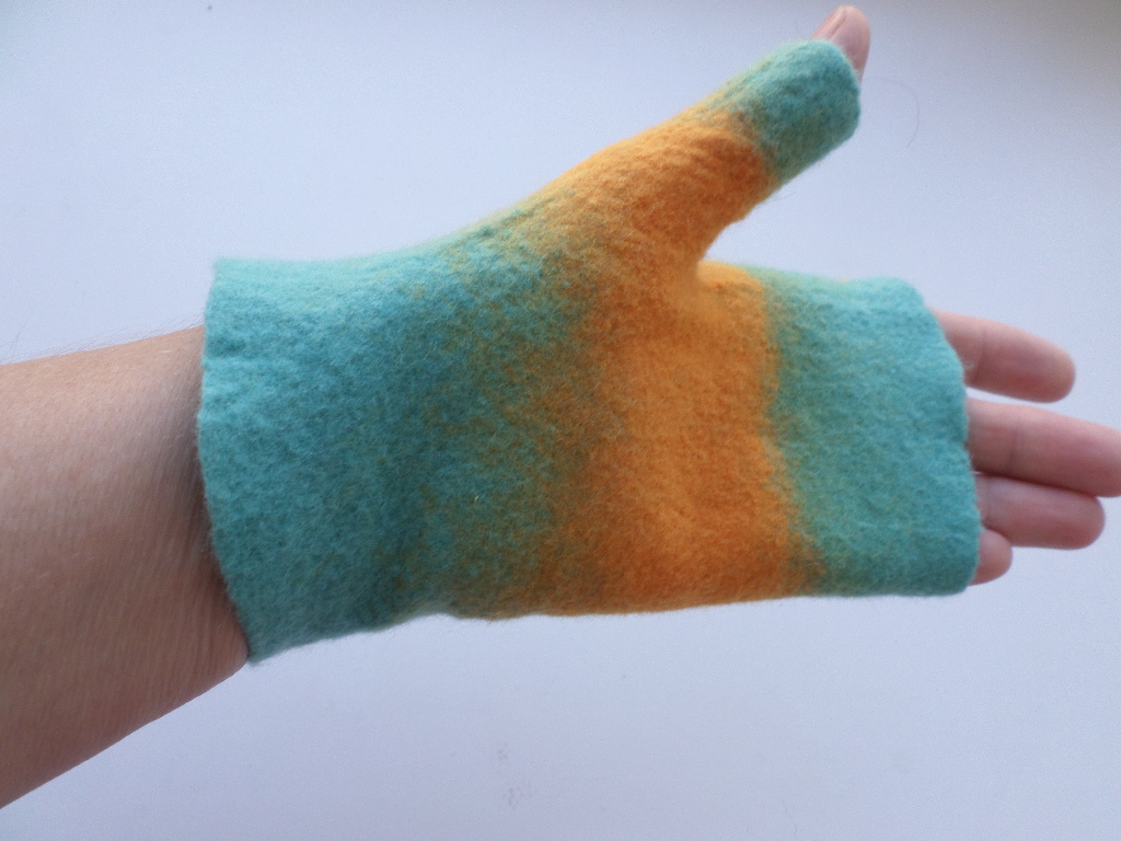 Валяный комплект из мериносовой шерсти.Шапочка и митенки, украшены волокнами вискозы, льна и синтетической органзы, она была покрыта вискозой и привалялась очень хорошо. Фактура мне понравилась, думаю что я и дальше буду ее использовать в декоре