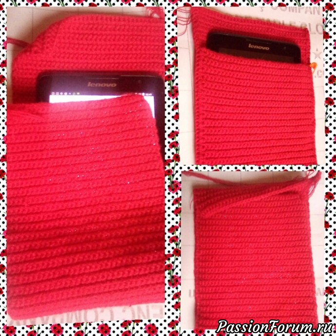 Вяжем прямоугольник ст.б/н за обе петли см фото. Затем соединяем ст.б/н. с обеих боков, оставляя примерно 5 см. в зависимости от толщины планшета для закрывания см.фото. Пришиваем липучку.