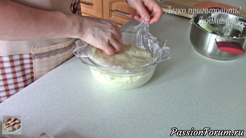 Затем готовый крем перекладываю в миску, накрываю его пищевой пленкой прямо по поверхности крема, чтобы между кремом и пленкой не было воздушного пространства, и на пленке не образовывался конденсат, и капли воды не стекали бы опять в крем.