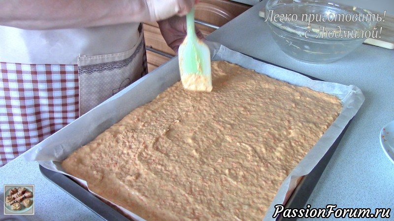 Перекладываю его на противень размером 30 см на 40 см, застеленный бумагой для выпечки, бумагу маслом я не смазывала.