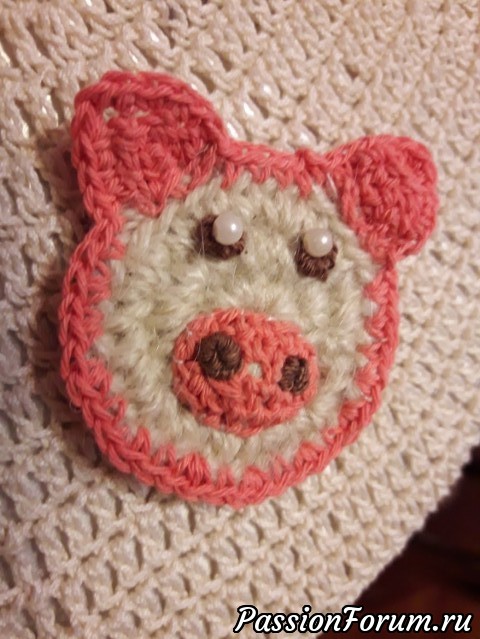 Коричневой пряжей пришиваем пятачок, при этом располагаем стежки таким образом, чтобы получились ноздри пятачка. Так же коричневой пряжей вышиваем глазки.