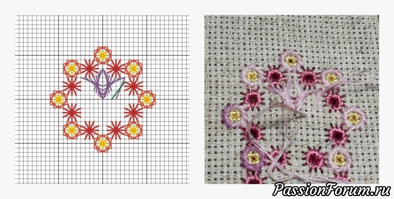 Прежде, чем начнете выполнять, хочу предложить немного другой алгоритм выполнения. Помните, я вам говорила об "опорных точках"? Так вот сейчас они нам очень пригодятся), чтобы вышить без ошибок и много не считать. Посмотрите, как такой цветок на этой работе вышивала я.