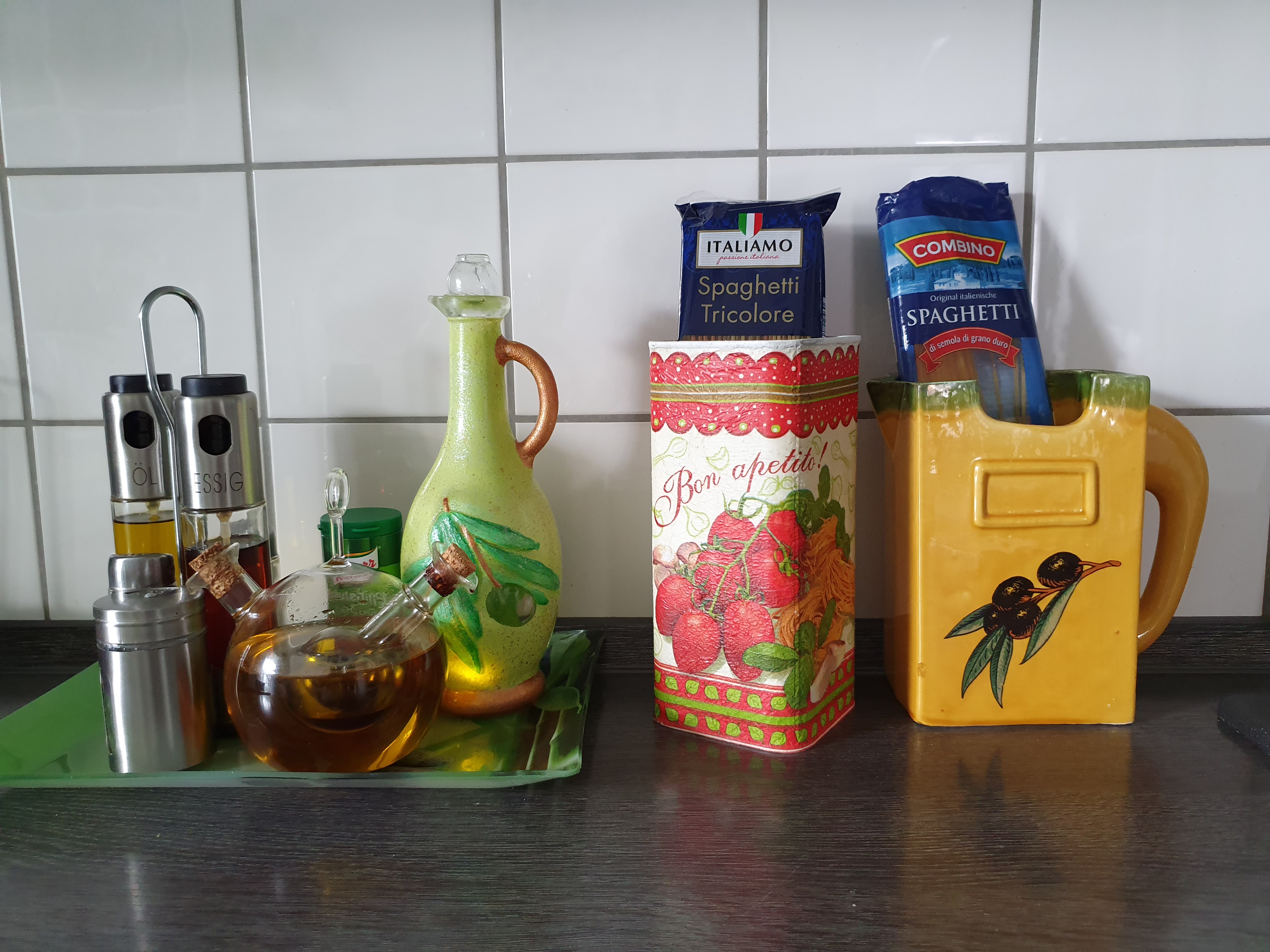 А это поближе хочу показать стеклянную бутылочку под олифковое масло. Железная банка для хранения спагетти . Кувшин купила месяц назад , в отпуске, в Испании. Он подружился с банкой, даже она поделилась с ним пачкой спагетти...! Придумаю потом ему применение.