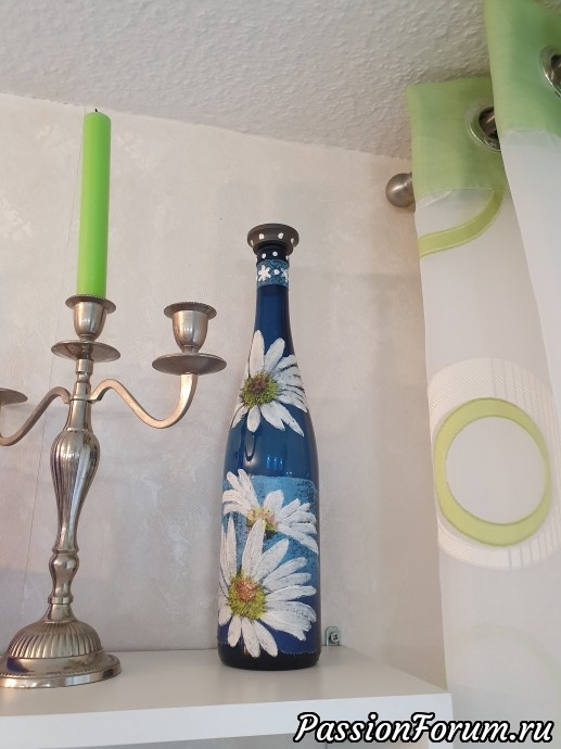 На верхней полочке хранится моя первая украшенная бутылочка. Я тогда и про декупаж-то ничего не знала... Попалась салфетка с красивыми ромашками, так захотелось её сохранить вот и придумала... чем клеила- не спрашивайте... ПВА в то время дома не водилось. А вот бутылку с виноградом выполняла по всем требованиям . Голубая бутылочка очень мне нравится , многие просили подарить - пожелела... себе оставила. тоже первый вариант- картинка из журнала, подрисовка, украшена бисером.