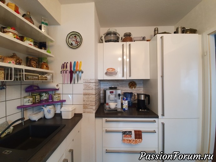 Кухня наша не очень большая , вытянутой формы , я конечно , больше люблю квадратные , но постаралась создать уют и в такой.На стене вы вмдете тарелки - одна из них моя, зелёненькая, с бутылочкой виноградного вина. Моя любимая доска для хлеба - большая , из массивного дерева. А хлебница - фанерная, обе оформлены декупажем из одинаковых салфеток.