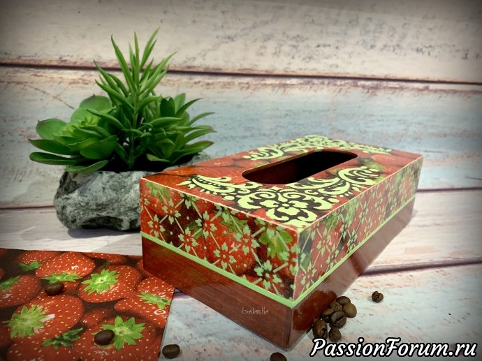 В работе использовала морилку цвета вишня, салфетки, трафареты и структурную пасту, которую я подкрасила акриловой краской. Сверху глянцевый лак.