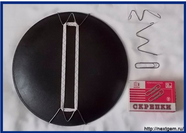 "Если вы хотите тарелочку повесить на стену, для неё можно сделать вот такой держатель. Для его изготовления можно использовать большие канцелярские скрепки и бельевую резинку. Для тарелочки диаметром 23-24 см возьмите резинку длиной 20см и сшейте в колечко"