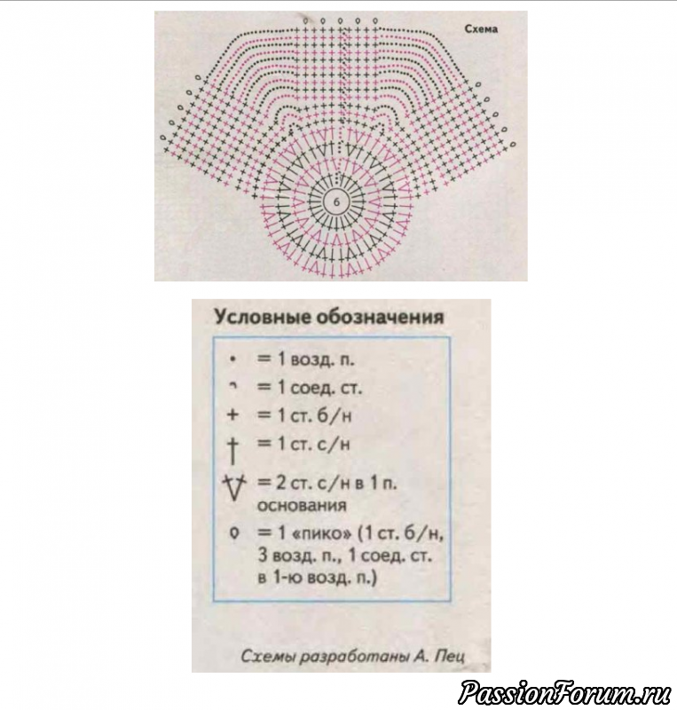 Белой нитью свяжите цепочку из 6 возд. п. и сомкните её 1 соед. ст. в кольцо. Далее вяжите круговыми рядами по схеме 1. Выполните 1 раз с 1-го по 17-й р., при этом 1-й, 6-й, 8-й, 10-й, 12-й и с 14-го по 17-й р. вяжите белой нитью, со 2-го по 5-й, 7-й, 9-й, 11-й и 13-й р. - розовой нитью.