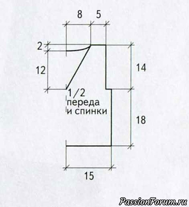 Затем разделите вязание пополам и далее каждую часть вяжите отдельно. Для скоса убавляйте в каждом ряду no 1 ст. с внутренней стороны. Проймы выполните аналогично спинке. На высоте спинки вязание закончите.