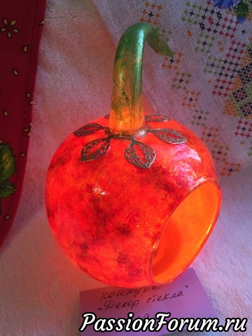 Больше полугода пролежала у меня стеклянная заготовка в виде яблока, подаренная друзьями, хотя два сына утверждают, что это тыква…))) Кому что, как говорится, молодёжи Хеллоуином голову задурили, а у меня даже и в мыслях не было…