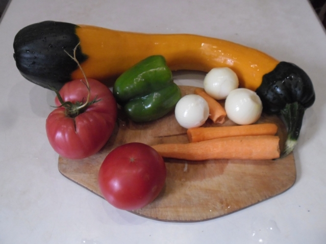 Устав от кружев, решила прогуляться по участку и посмотреть что и как, заодно "проветрить" глаза, тем более два дня не была, шли дожди. Оказалось, не так уж и плохо: насобирала помидоров кучу, огурцов, сладкий и горький перец, гламурный кабачок, морковку, петрушку и с полной корзиной пришла домой.