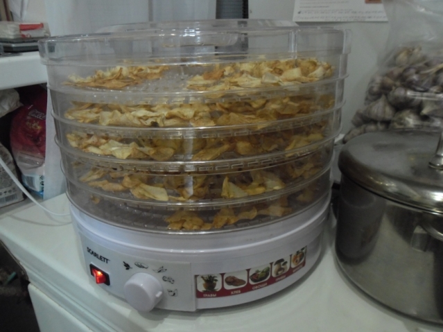 Пока тут все тушилось и закатывалось, я чистила и резала яблоки, затем из сушилки достала предыдущую партию и заложила новую. Разложив по пакетикам - положила на хранение на самый верх шкафчиков.