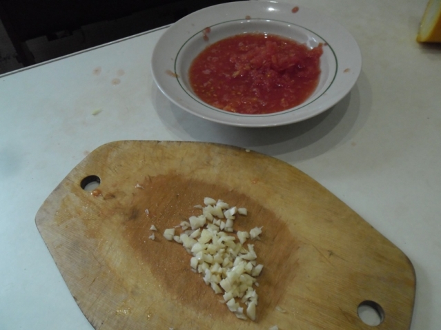 Тушим, закрыв крышкой. В это время надо порезать чеснок и натереть помидор на терке, чтобы не было шкурки