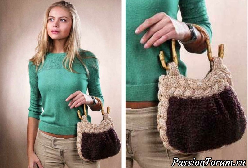 Вам потребуется:пряжа «Хозяюшка-рукодельница» (100% полипропилен, 50 г) - 100 г бежевого цвета, пряжа «Букле» (88% шерсть, 12% нейлон, 115 м/50 г) - 50 г коричневого цвета, спицы №3, бамбуковые ручки.