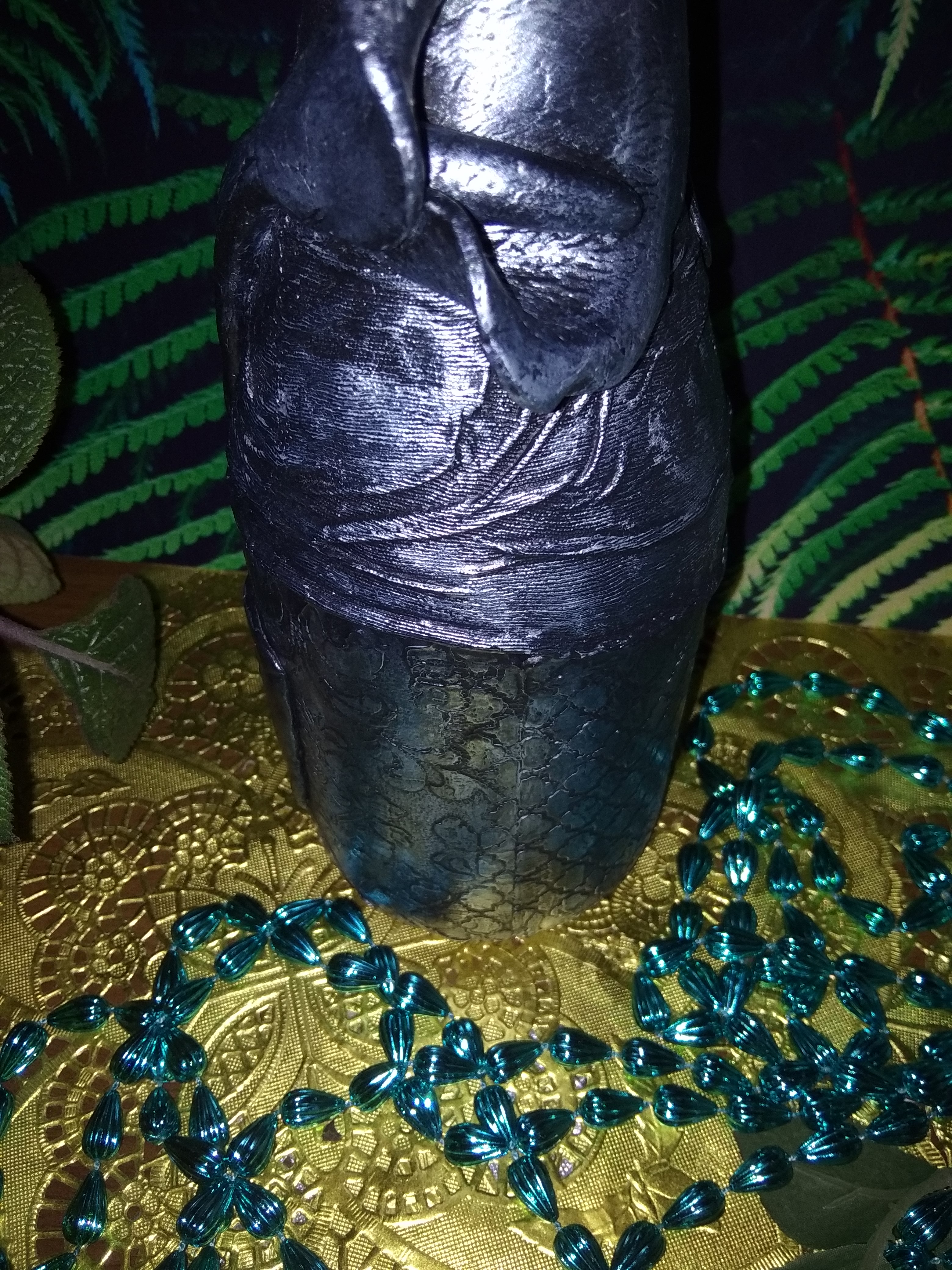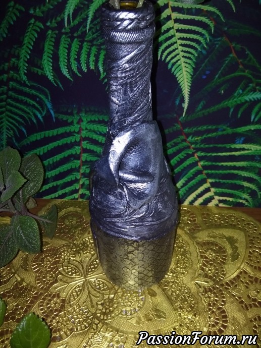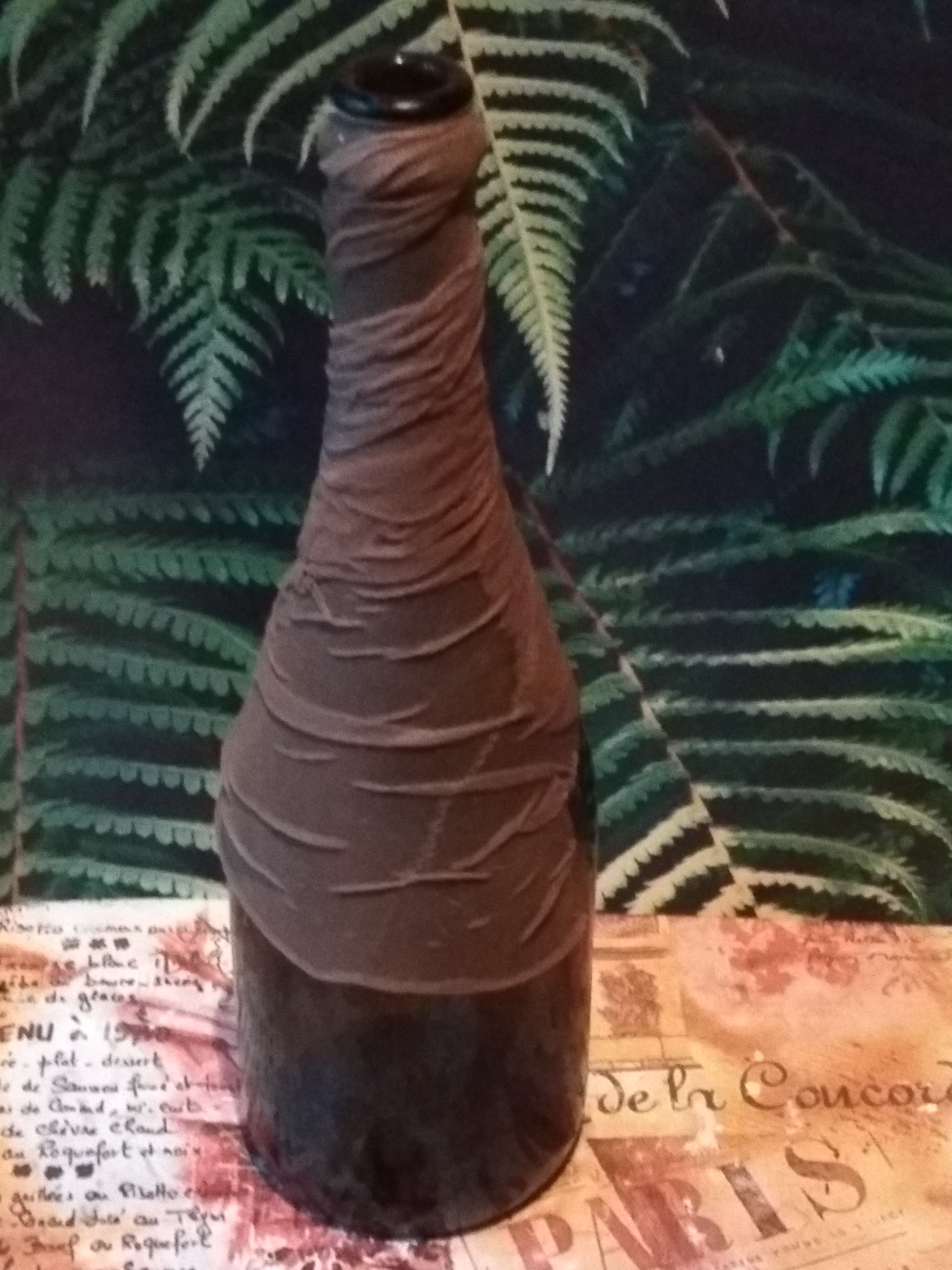 Бутылку подготовить к работе. Ткань или колготки пропитываем клеем строительным,формируем складочки, в моём случае это асимметричные складочки.Сушим.Всю полученную фактуру и бутылку покрываем лаком смешанным с краской или стекло грунтуем грунтом по стеклу. Сушим.Грунтуем акриловым чёрным грунтом, Сушим.Лакируем поверхность.Сушим.Через трафарет наносим рисунок моделирующей гель пастой.Сушим.