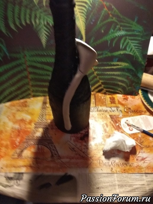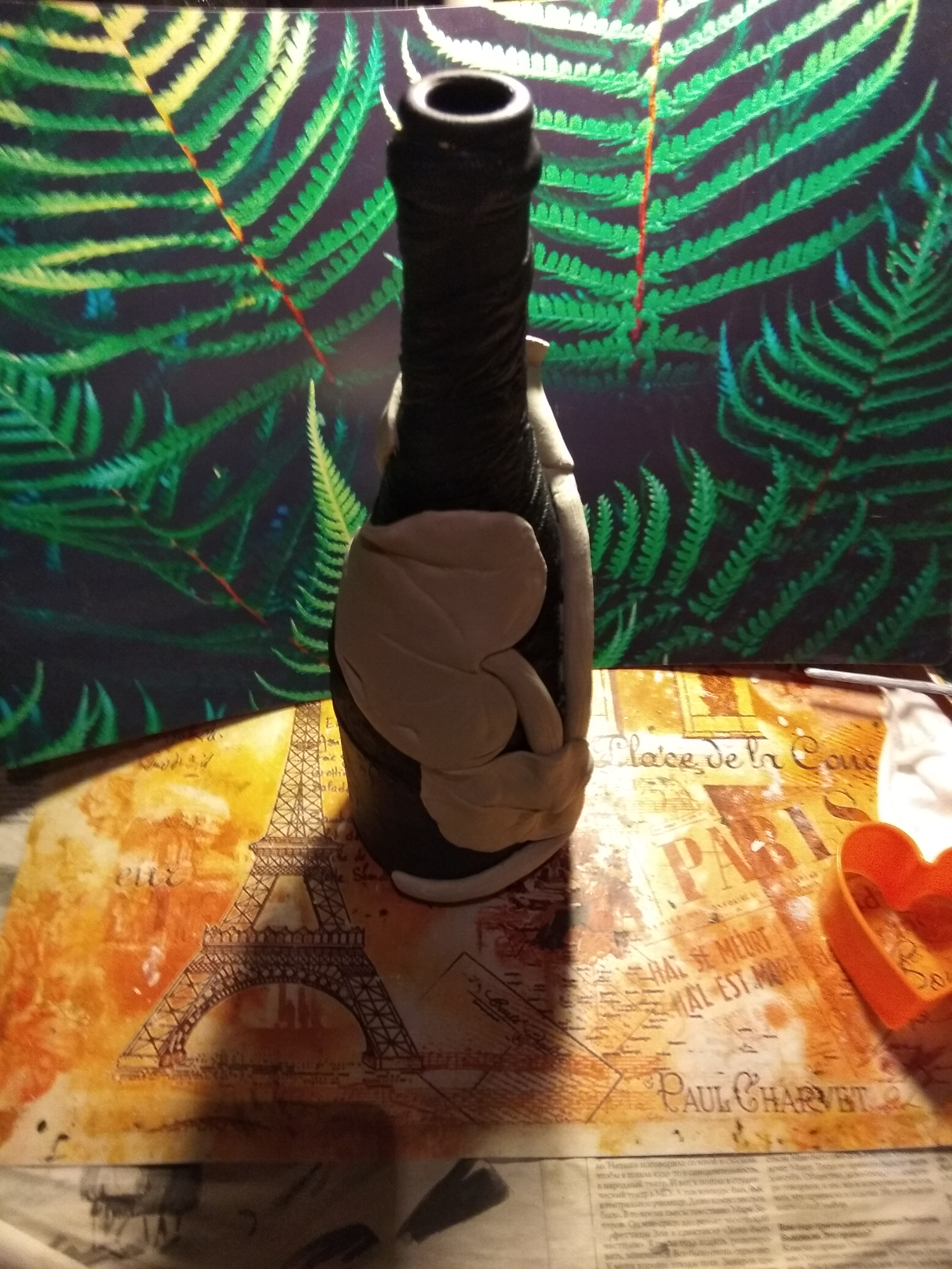 Аккуратно прикладываем на бутылку формируем будущую композицию.Определились, оценили, понравилось,клеем наш цветок.Пока глина влажная можно ещё немного поработать над цветочком,отгибая и слегка вытягивая к низу кончик бутона, хотя можно этого не делать,так как у каллы есть разные формы бутона.У стебелька зубочисткой проводим полосочки (для фактуры)