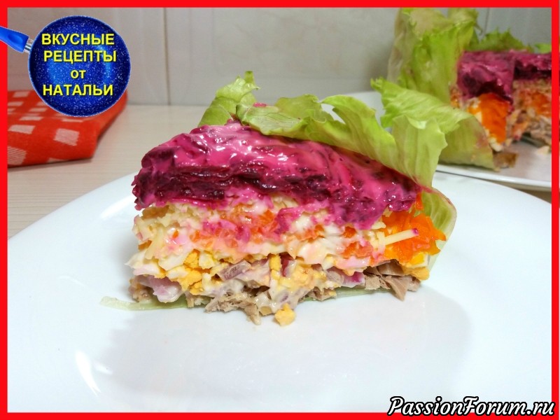 Сборка салата.На дно форма кладу листья салата,затем слой мяса распределяю равномерно и делаю сеточку из майонеза.На мясо кладу слой лука,затем яйца и сеточка из майонеза.Следующий слой морковь и слой майонеза,затем тертый сыр и слой майонеза и отварная свёкла и майонез.Отправляю салат в холодильник на 2-3 часа.