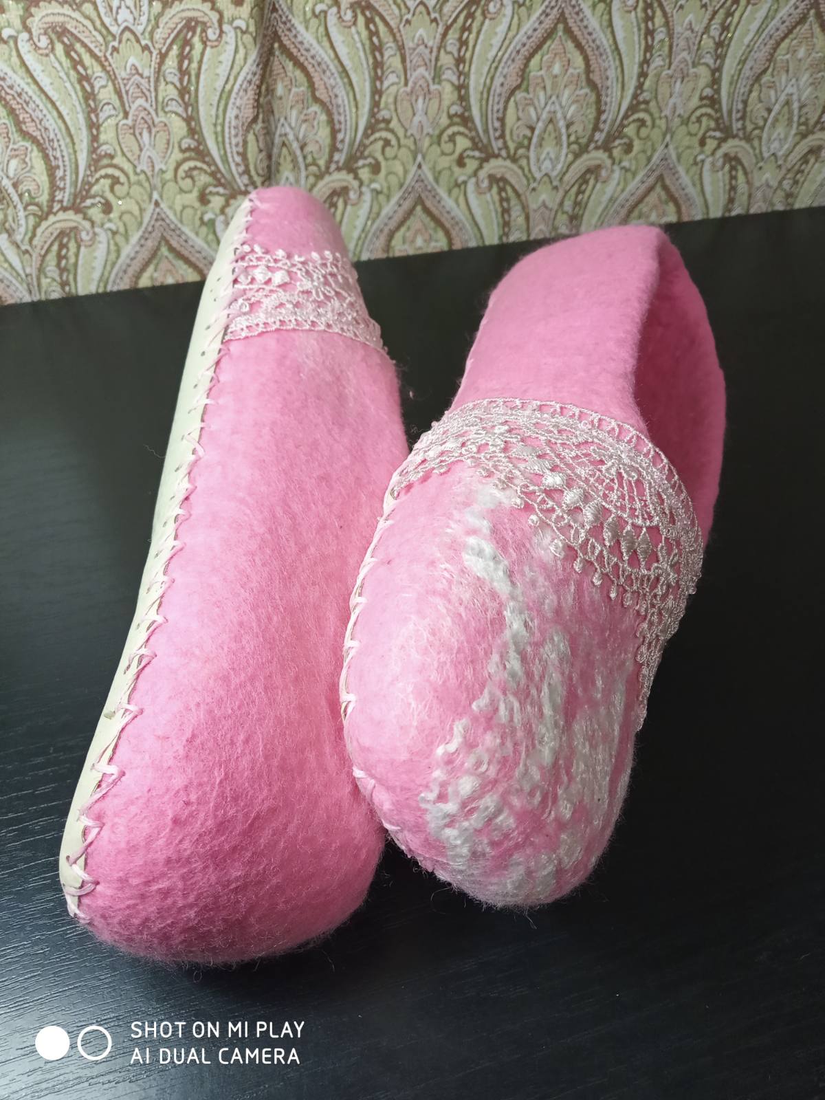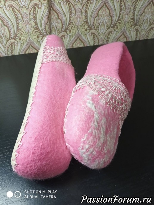 Доброго дня! Насмотрелась на работы девочек и вот ...опять... руки "чешутся" , желание свалять - перебороло желание полежать на диванчике)) Был у меня запас розовой шерсти, и все не могла придумать, ну что из этого можно сделать, и зачем я ее такую покупала...На тапульки ушло 180 грамм шерсти меринос Италия, вискоза белого цвета Болгария и совсем чуток кружево. Колодка на 36 размер. Кружево пришивала с бисером.
