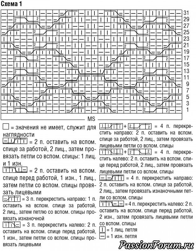 Вязать по кругу сначала по схеме 1. На схеме даны нечетные ряды. В четных рядах петли провязывать по рисунку. В высоту выполнить 1 раз с 1-го по 32-й круг.р., затем повторить еще 1 раз с 1-го по 12-й круг.р. = всего 44 круг.р.