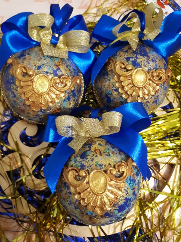 Шар и сердечко из пенопласта. Обклеен 3-им слоем салфеток, грунтовка, покраска золотым металликом Эмаль акриловая), одношаговый кракелюр, истончённая распечатка, контуры, жидкий жемчуг, полубусины под жемчуг.Патинирование коричневой краской и тёмное золото.Лакировка акриловым лаком полуматовым.Бант и кисточки из атласных лент.