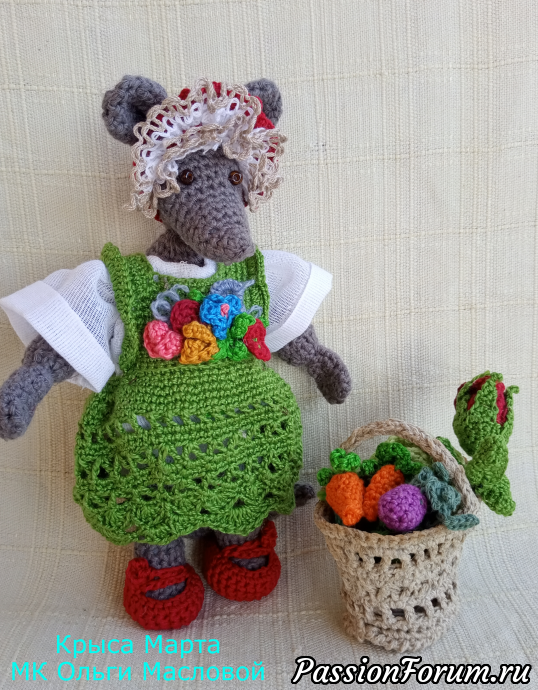Сарафан, шляпка, туфельки, овощи, роза связаны из ириса. Корзинка связана из хлопка и накрахмалена.