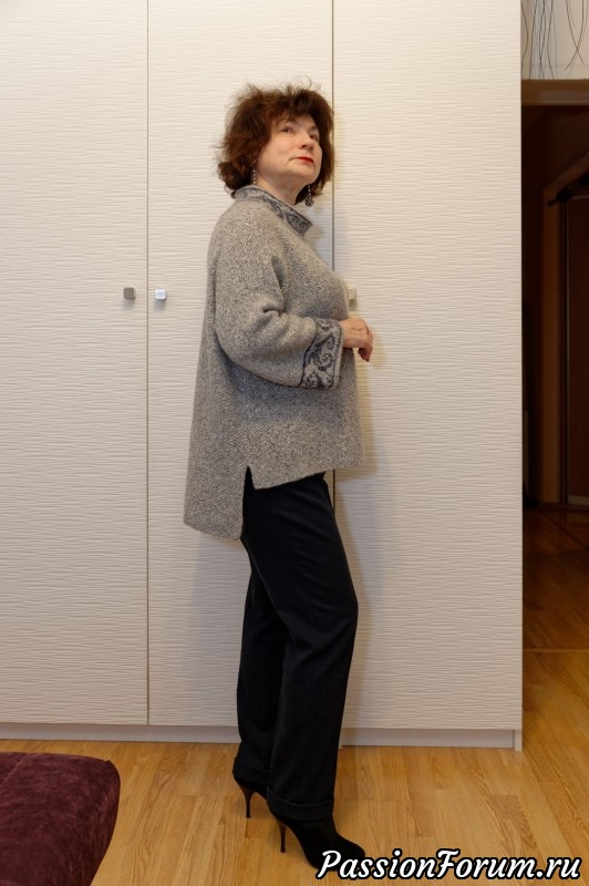 Но нагрудных вытачек, мне кажется, не хватает. Можно аккуратно (Кашемир, же!) с помощью пара и утюга симитировать их. Посадка сразу улучшится: полочка станет ближе к животику, что придаст стройности фигуре. Но в целом, вещь замечательная, уютная, роскошная!
