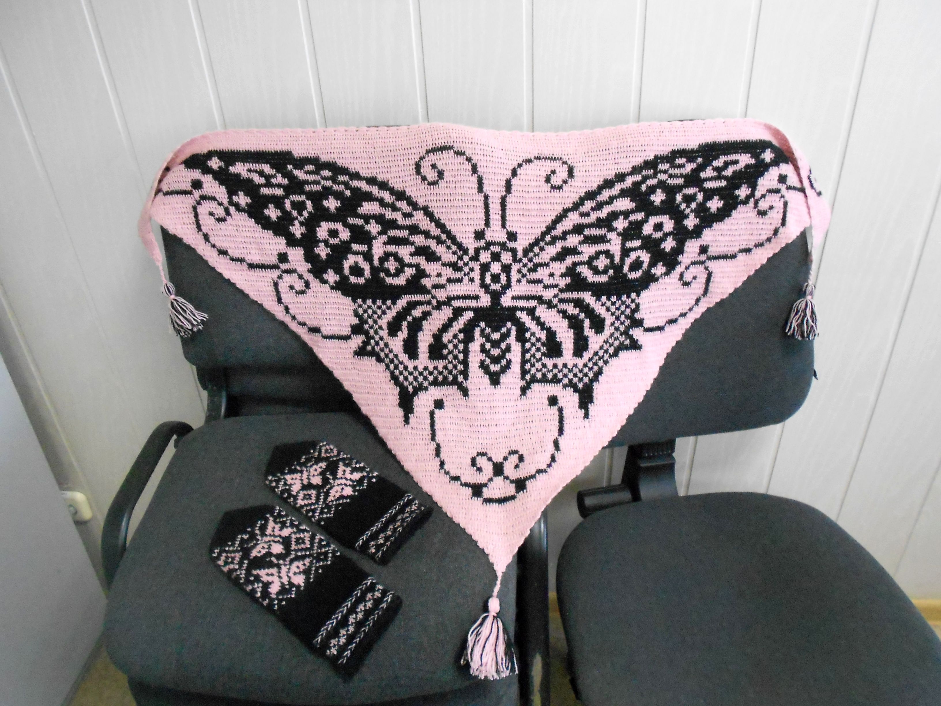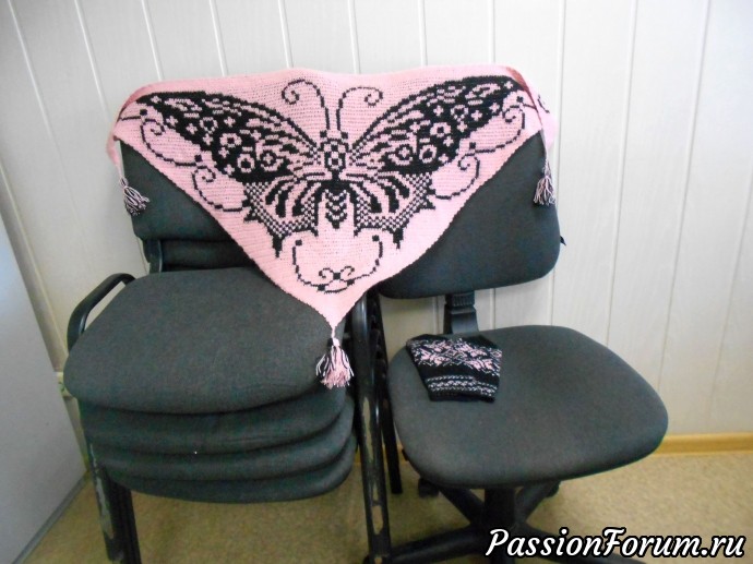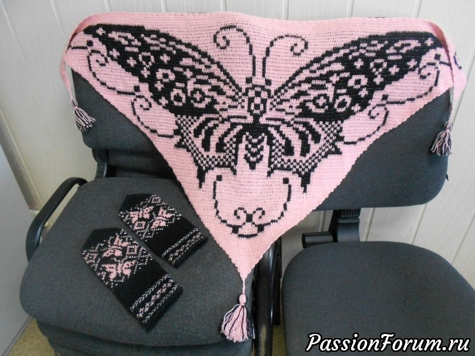 Бактус выполнен из полушерсти (50% шерсть, 50% акрил). Рисунок "Бабочка" двухсторонний, одинаковый. Размер: размах -120см, высота шали -60 см, кисточки -7 см., вес 122 гр. К бактусу связаны варежки с бабочками. (на черном фоне розовые бабочки) Основной цвет- пыльная роза, бабочка вывязана черным цветом.Шаль-бактус нарядный и красивый аксессуар. Подходит к любому наряду, носить можно как шаль, накинув на плечи и как бактус красиво обернув вокруг шеи. Покупка комплекта: бактус + варежки, обойдется дешевле. Цена 1300 руб. + пересылка почтой России.