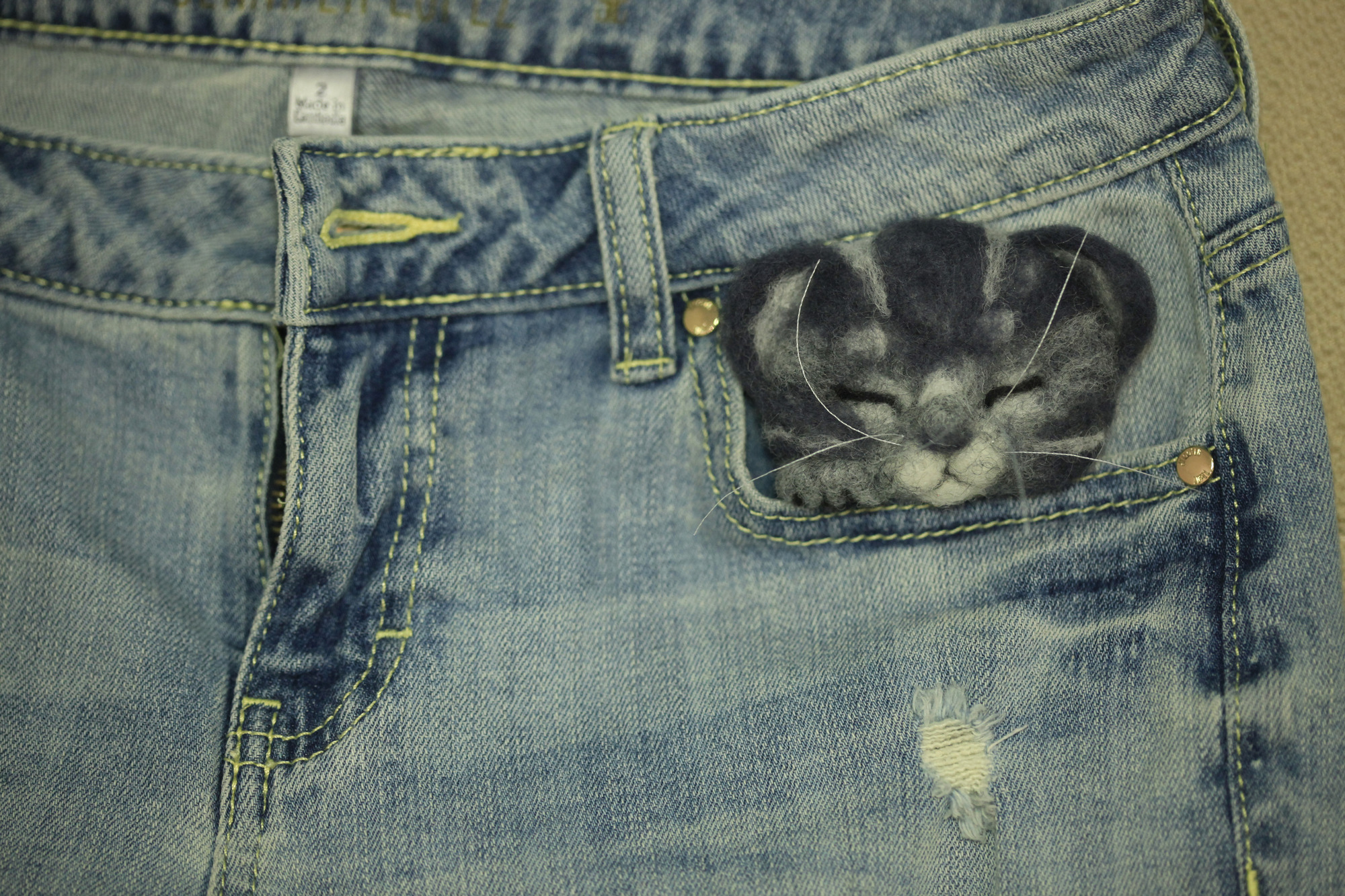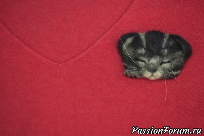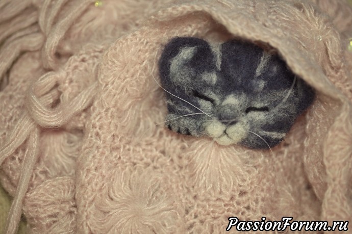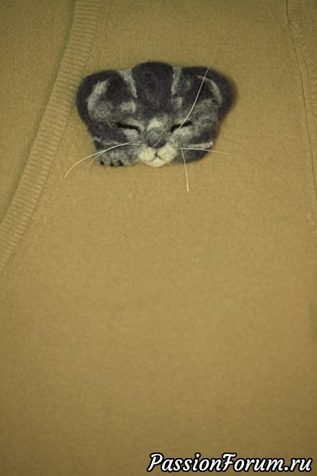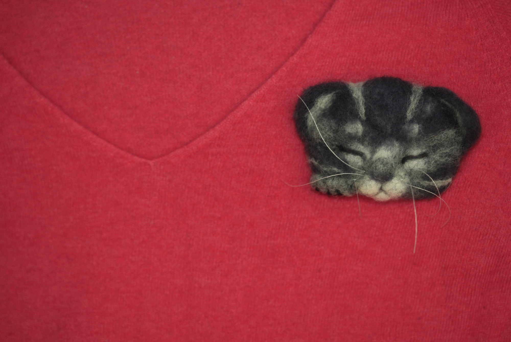 Брошь из шерсти спящий котик. Размер - 7х5 см.