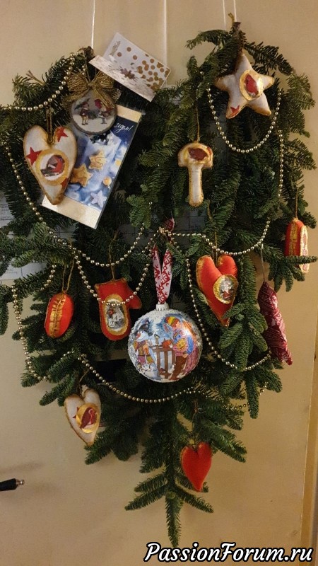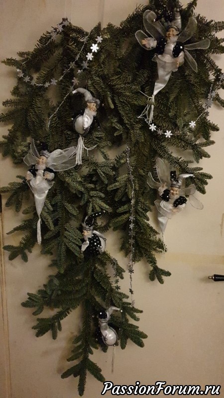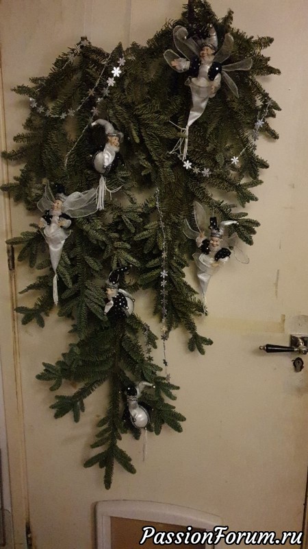 Все вы знаете, что у меня живёт гитерактивный кот. С тех пор, как мы привезли его, мы перестали ставить елки, просто не реально, но Рождество и Новый год не могут быть без ёлки. Вот я и придумываю каждый год, как сделать праздник. В этом году шесть больших ветвей повесила на дверь в зале, три внутри и три снаружи. Внутренние украсила серебром, а наружние ветки самодельными игрушками подареными Александрой (Ниточка) и открытками от девочек.