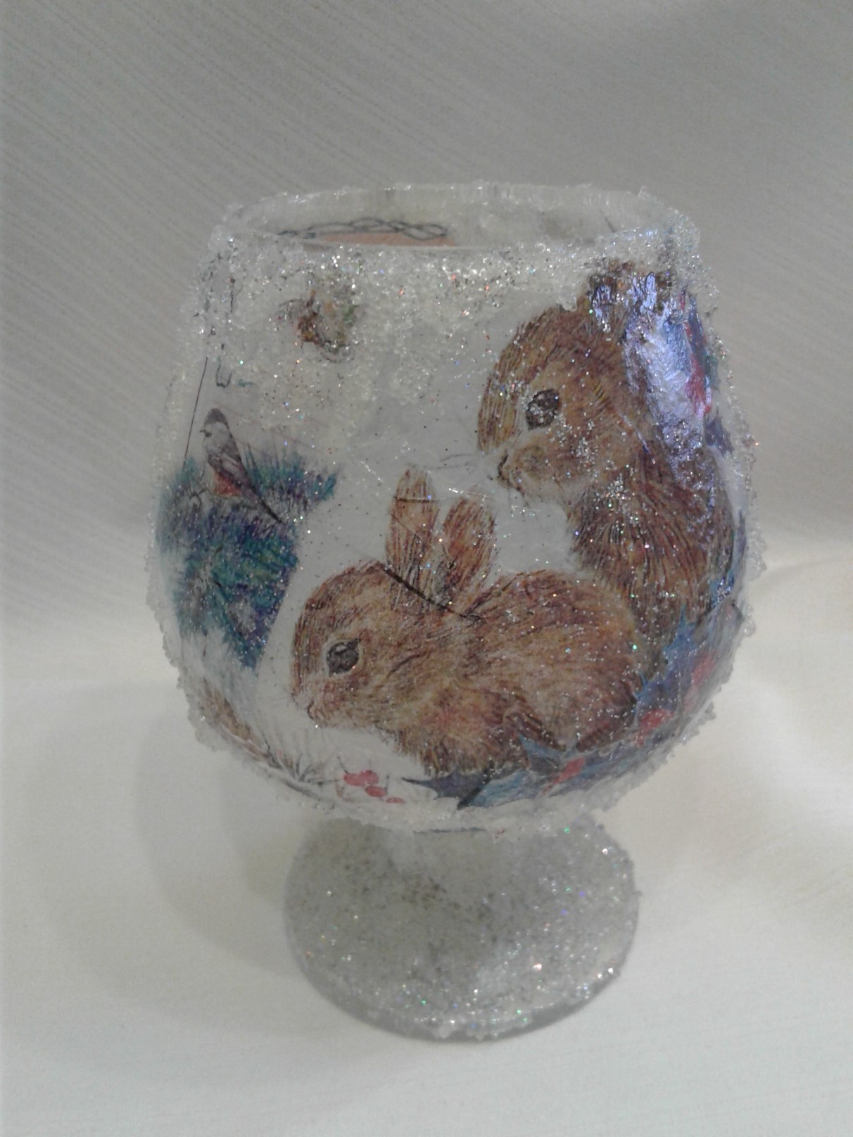 Первый раз попробовала сделать такой подсвечник. Использовала рисовую бумагу, а на свободных местах хрустальная паста. Весь переливается от блесток. Крутимся со всех сторон.