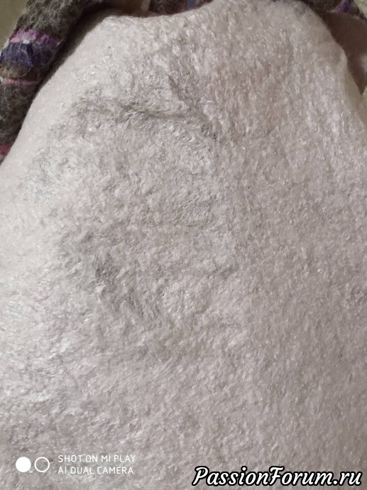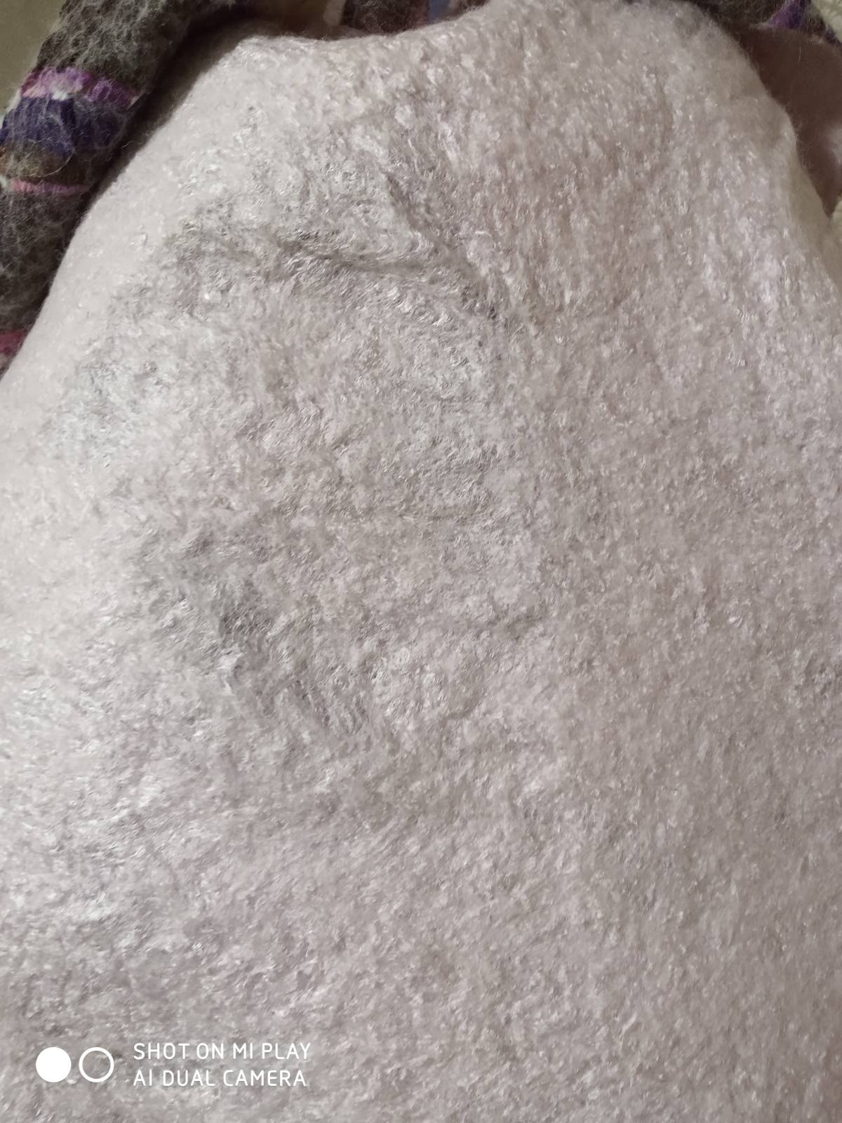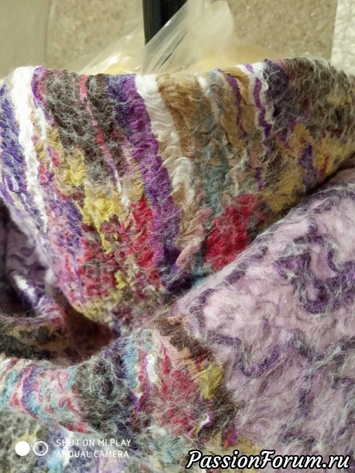По следам первой косынки решила уже и вторую свалять. Нашла в своих закромах материю (пошел сарафанчик в утиль)) в фиолетовых оттенках и ткань легкую и прозрачную, конечно тоже фиолетового цвета (держит форму)-не могу даже понять что это?))) Судя по результатам материя та еще синтетика, косыночка вышла плотнее, но не критично. Размер раскладки тот же и расход материалов аналогичен. Один минус того, что в том месте где лежит прозрачная ткань, с изнанки фактура неоднородная и пошла волнами. Это видно на фото. Шерсть больше пролезла через тканюшку.