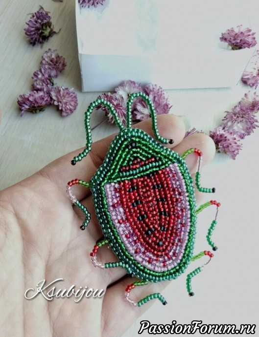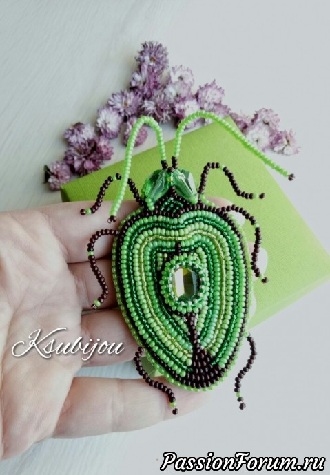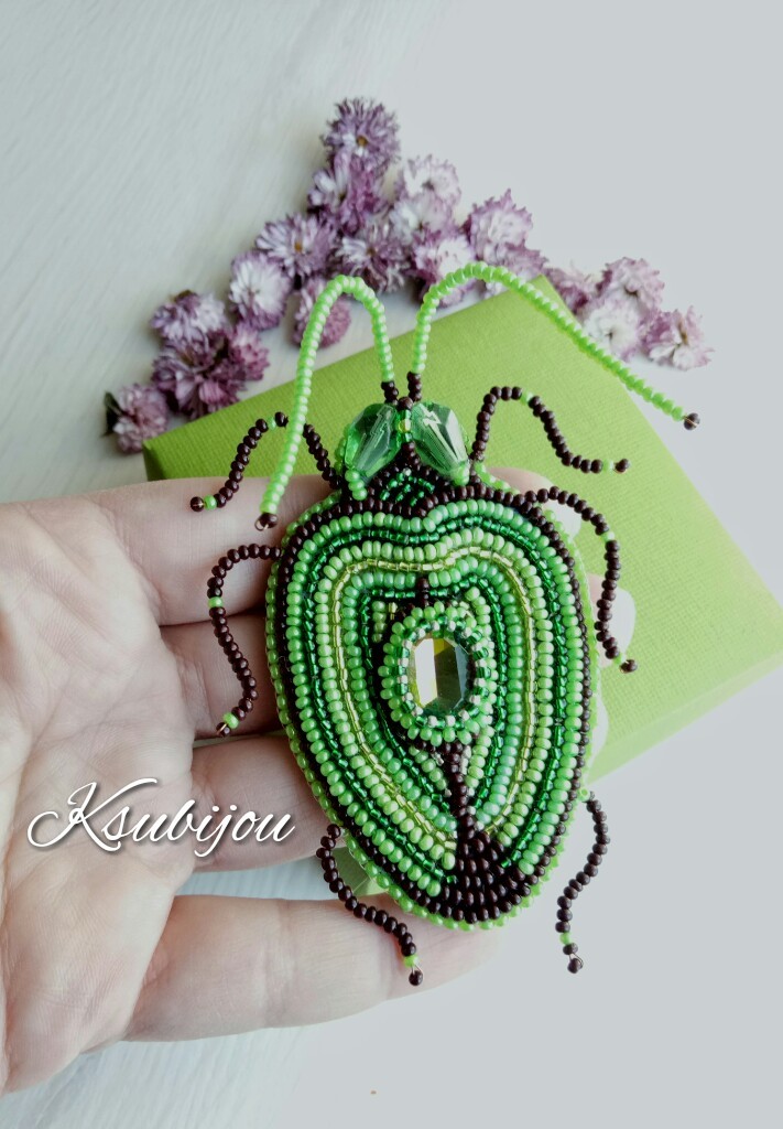 Жук. Зеленый жук с кристаллом на спинке, с подвижными лапками и усиками.