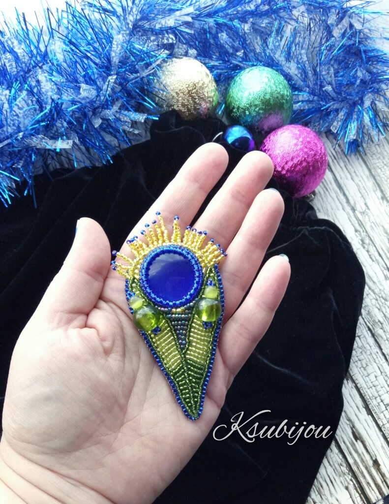 Новогоднее перышко. брошь с иск.кошачьим глазом и бусинами лэмпворк.